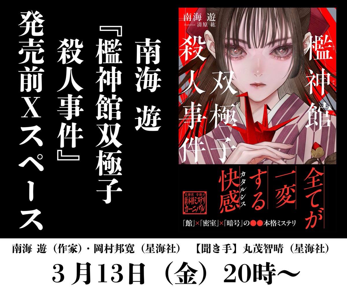 南海遊さん新作本格ミステリ『檻神館双極子殺人事件』の「発売前Xスペース」を、ただいま最前線のX( @sai_zen_sen )にて公開中です。
